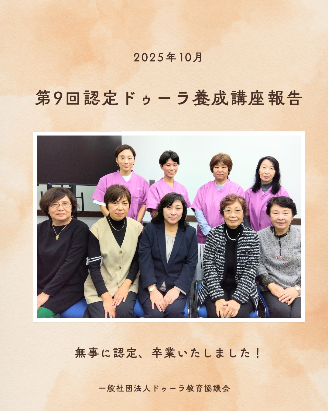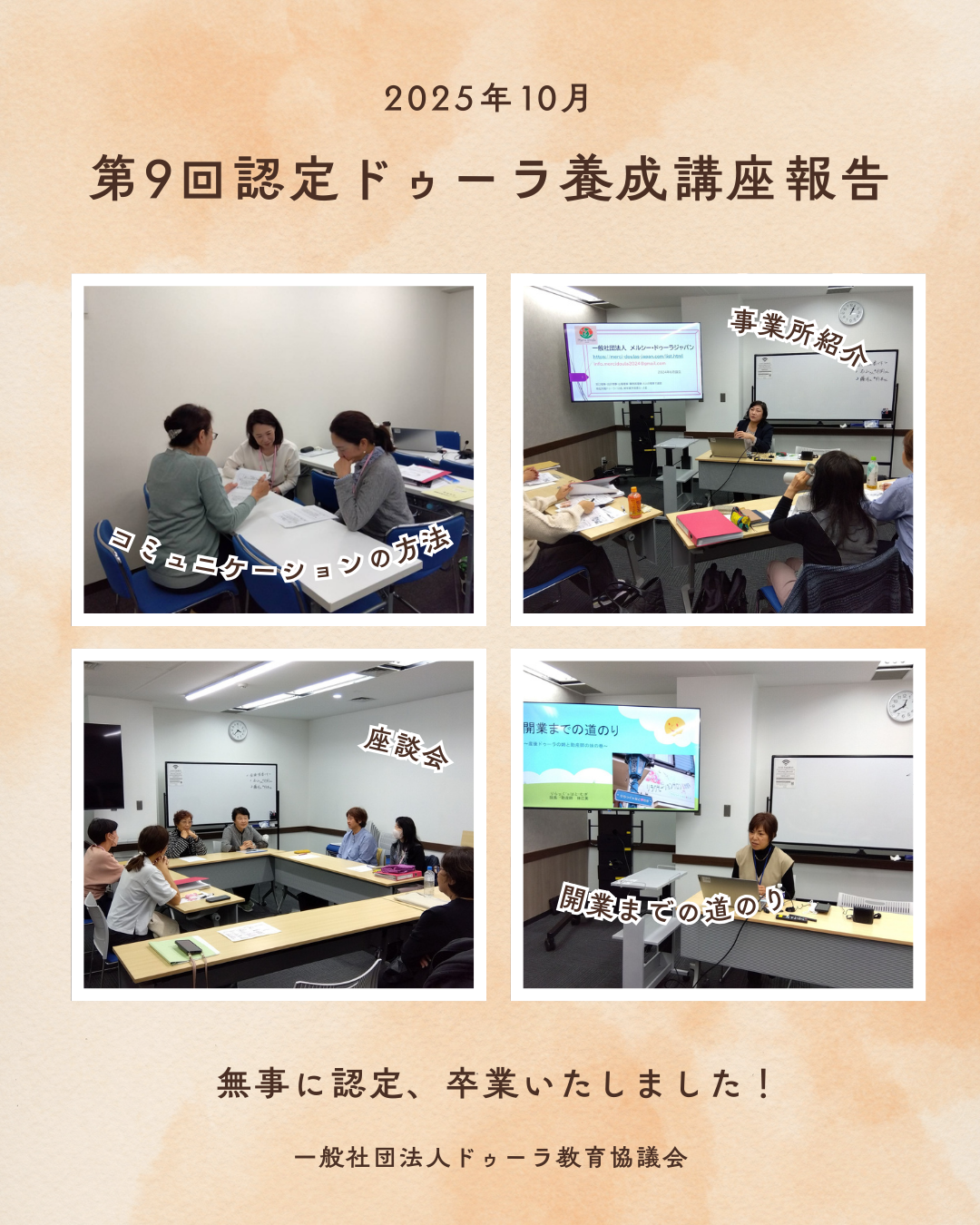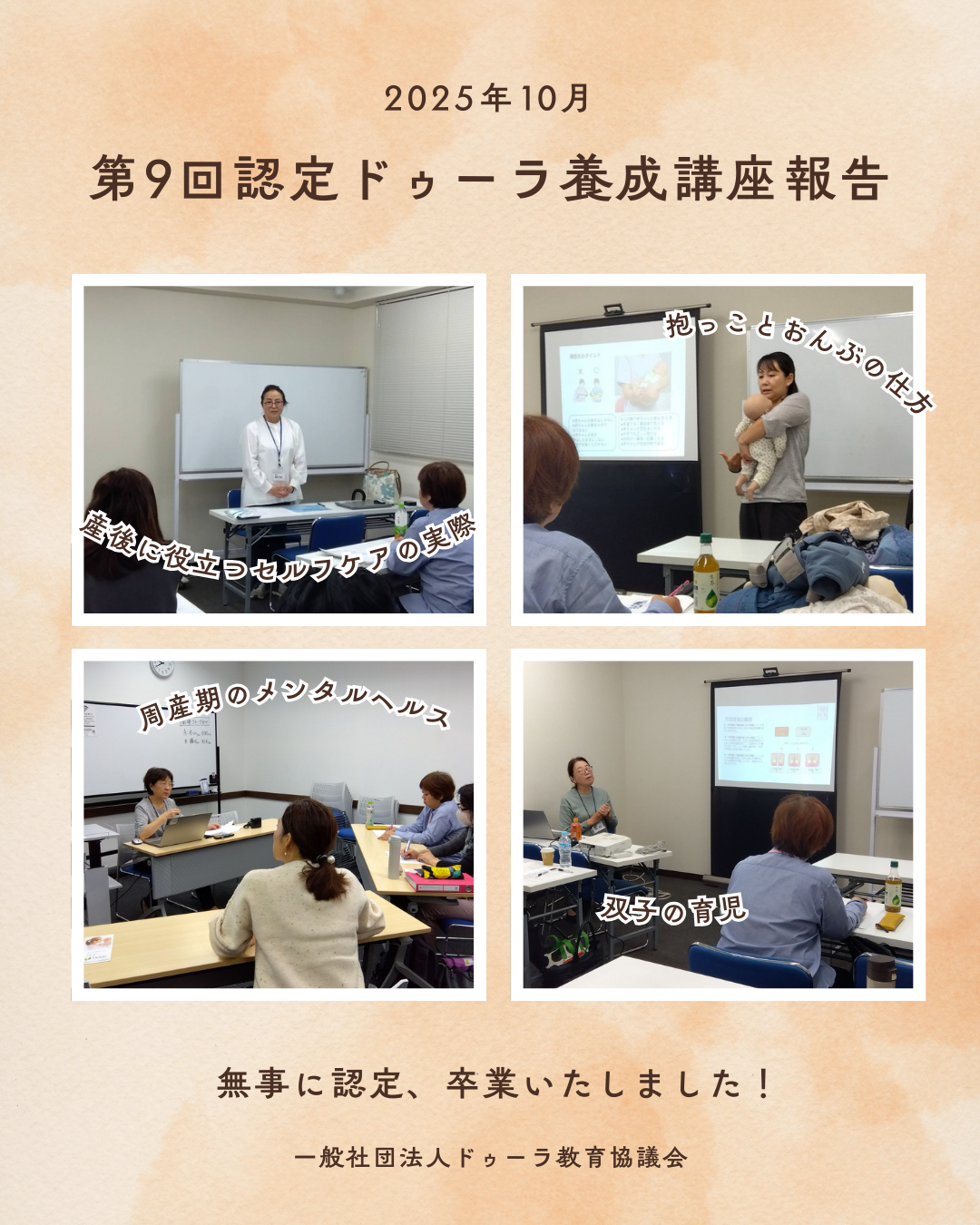 第9回認定ドゥーラ養成講座 第9回認定ドゥーラ養成講座の申し込みを開始いたします。 申込みは定員になり次第終了いたします! こちらのフォームからお申込みをお願いします。 第9回ドゥーラ認定講座申し込みフォーム 第9回ドゥーラ認定講座申し込みフォーム